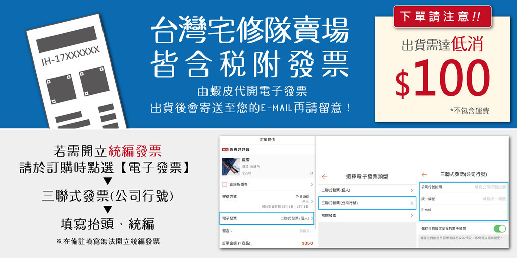 ◎ 【蝦皮代開電子發票】若需統編發票下單時記得選擇【三聯式發票】依步驟填寫資訊,出貨後發票會寄至您的電子信箱,只有在備註欄留言統編無法協助開立,再請留意!
